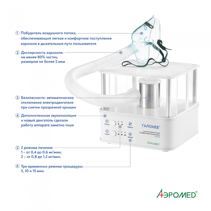 - Индивидуализация лечения благодаря двум рабочим режимам производительности сухого аэрозоля хлорида натрия (0,4-0,6 мг/мин и 0,8-1,2 мг/мин.) и возможности выбора длительности процедуры (5, 10, 15 минут).